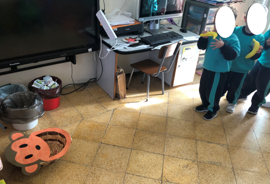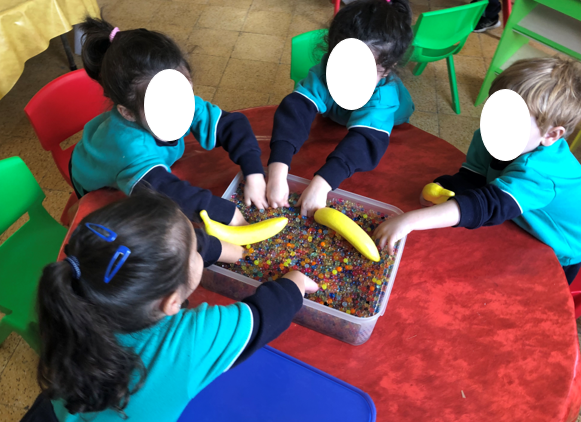 Today we explored monkeys as they too, live in the jungle. We found a bunch of banana’s hidden in a sensory bin filled with Orbeez. Banana’s are a monkey’s favourite food.