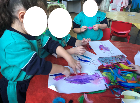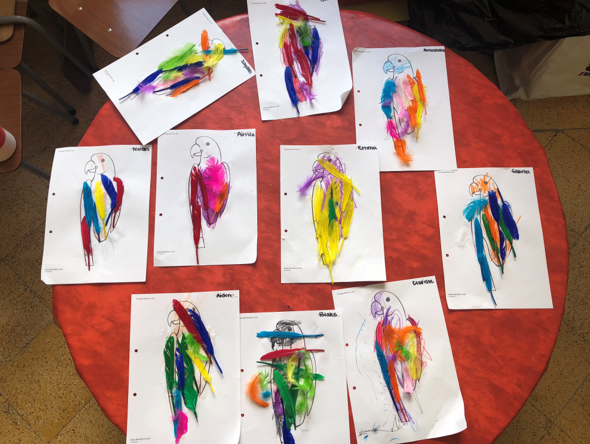 Each child made a unique and beautiful parrot, using different coloured crayons and feathers.