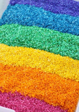 To make the coloured pasta, simply add pasta and paint to a ziplock bag, shake and let them dry. Then cut out a shape of an egg on a cardboard paper and let the children express their creativity.